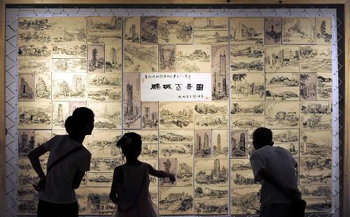 8月26日,幾位觀眾在觀看馮明創(chuàng)作的鵬城百景圖。新華社記者 陳曄華 攝