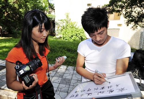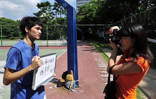 湯文芳(右)在拍攝深圳大學(xué)一位學(xué)生在小白板上寫下的祝福。