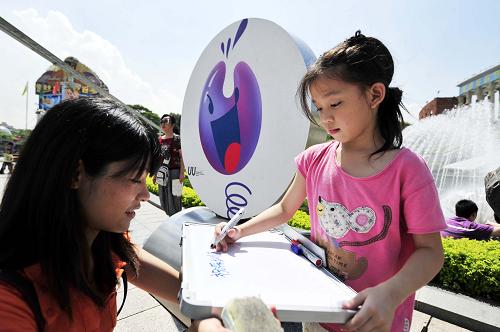 湯文芳(左)在深圳世界之窗請一名小游客在小白板上寫下對深圳的祝福。