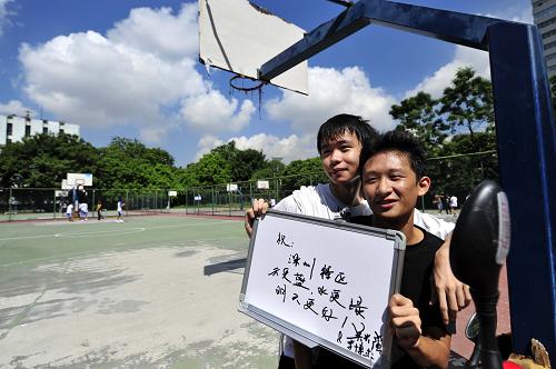 湯文芳(左)在深圳大學(xué)校園里請同學(xué)在小白板上寫下對深圳的祝福。