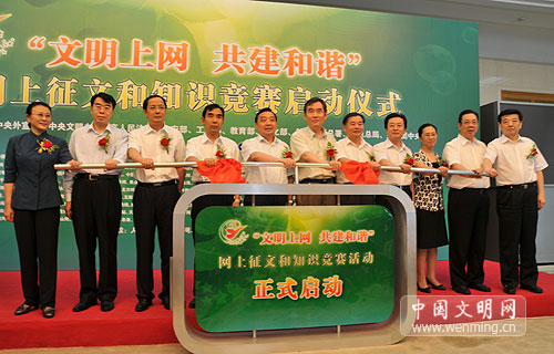 中國(guó)文明網(wǎng)8月19日消息 “文明上網(wǎng),共建和諧”網(wǎng)上征文和知識(shí)競(jìng)賽活動(dòng)19日在人民大會(huì)堂舉行啟動(dòng)儀式。這是由中央外宣辦、中央文明辦、最高人民法院、公安部、工信部、教育部、文化部、新聞出版總署、廣電總局、共青團(tuán)中央等指導(dǎo),人民網(wǎng)、新華網(wǎng)、中國(guó)網(wǎng)絡(luò)電視臺(tái)及新浪網(wǎng)、騰訊網(wǎng)等195家網(wǎng)站聯(lián)合主辦的。有關(guān)指導(dǎo)單位負(fù)責(zé)人和人民網(wǎng)、新華網(wǎng)等聯(lián)合主辦此次活動(dòng)的網(wǎng)站負(fù)責(zé)人出席了啟動(dòng)儀式。征文和知識(shí)競(jìng)賽活動(dòng)從8月19日開(kāi)始至10月底結(jié)束。