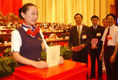 7月24日,來自中國東方航空西北公司的“全國青年文明號”乘務長朱喆在北京人民大會堂舉行的中國共產(chǎn)主義青年團第十五次全國代表大會第二次全體大會上投票。當日,出席共青團十五大的1500多名青年代表以無記名投票方式選舉產(chǎn)生了中國共產(chǎn)主義青年團第十五屆中央委員會。新華社記者袁滿攝
