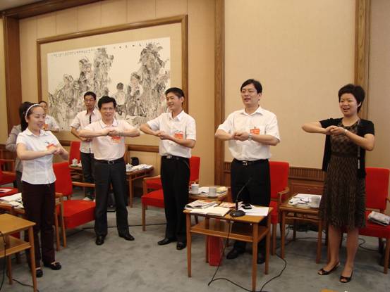 小組會上,團(tuán)十六大開幕式獻(xiàn)詞少先隊員之一劉丹陽所在學(xué)校的教師-來自宜昌市特殊教育學(xué)校的教師嚴(yán)娜在發(fā)言后,現(xiàn)場教授各位代表做“中國加油”、“我們永遠(yuǎn)在一起”、“我愛共青團(tuán)”等手語。