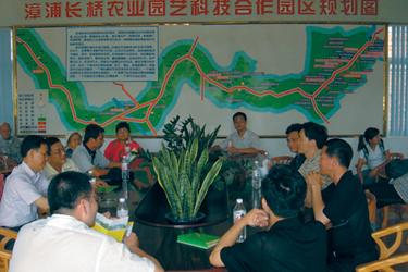 圖1:漳州市漳浦縣海峽兩岸農(nóng)業(yè)合作實驗區(qū)負責人向訪問團介紹情況。