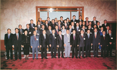 圖片:中共中央政治局常委、全國政協(xié)主席李瑞環(huán)(前排左七),全國政協(xié)副主席、中央統(tǒng)戰(zhàn)部部長王兆國(前排右六),全國政協(xié)副主席、中國和平統(tǒng)一促進會會長萬國權(quán)(前排左五)等與訪問團全體成員合影。