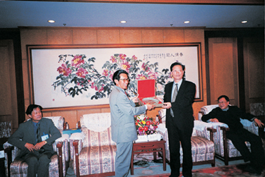 圖1:訪問(wèn)團(tuán)一行在杭州受到浙江省政協(xié)領(lǐng)導(dǎo)的親切接見(jiàn),圖為浙江省委副書記、省政協(xié)主席李金明“右二”向訪問(wèn)團(tuán)團(tuán)長(zhǎng)夏康民“右三”贈(zèng)送禮品。
