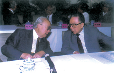 圖1錢偉長會長(左)與全國政協(xié)副主席吳學(xué)謙在主席臺親切交談。