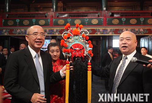 5月25日,中國國民黨主席吳伯雄在北京湖廣會館接受湖廣會館館長贈送的關(guān)公臉譜。當日,中國國民黨主席吳伯雄率領(lǐng)中國國民黨大陸訪問團抵達北京,開始訪問大陸行程。吳伯雄一行當天下午參觀了北京湖廣會館。新華社記者 邢廣利 攝