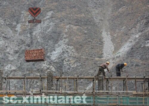 4月18日,工人在汶川一中重建工程施工現(xiàn)場工作。 新華社記者邢廣利 攝 |
