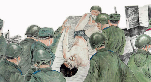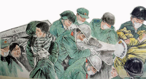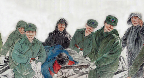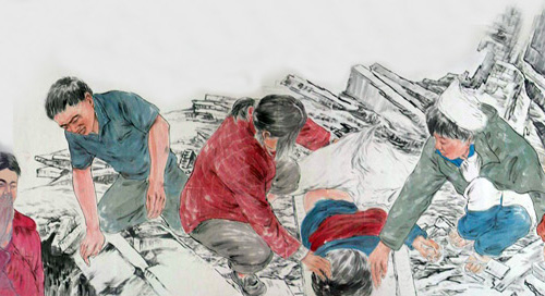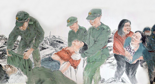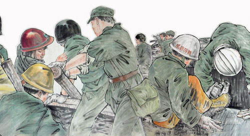 這幅被命名為《振起豐碑》的國畫人物長卷,高1米多,長100多米,裱好后的重量達30多公斤,畫卷中的人物多達600多名,有領(lǐng)導(dǎo)人親臨一線指揮救災(zāi)的情景,有解放軍官兵奮力救災(zāi)的情景,有醫(yī)務(wù)人員冒險救死扶傷的場面,還有從廢墟中被救出的人們,感嘆劫后余生的場景。