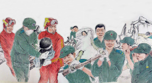 畫卷以解放軍戰(zhàn)士正從廢墟中救人的畫面開頭,中間穿插了上百組救災(zāi)過程中的感人場面。敬禮娃娃郎錚、芭蕾女孩李月、英勇的解放軍戰(zhàn)士、善良的白衣天使等在四川汶川大地震中備受關(guān)注的人物,均被郭永潔用畫筆記錄在畫卷上,畫面最后定格在救援人員抬著擔(dān)架爬坡的場景上。