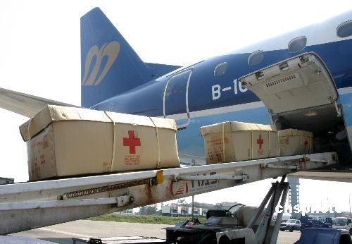 資料圖片:2008年5月20日,兩岸人道包機再度啟動,載運紅十字會醫(yī)療隊前往四川地震災區(qū)。圖為臺灣紅十字會救援物資進入包機貨艙畫面。 中新社發(fā) CNA 攝