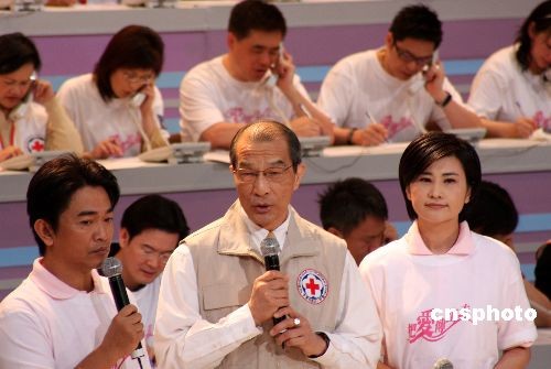 資料圖片:2008年5月18日晚,臺灣紅十字會會長陳長文(前排中)、臺北市長郝龍斌(后排中)參加為四川賑災募款的“把愛傳出去”大型晚會,鼓勵民眾踴躍捐款。 中新社發(fā) 陳立宇 攝