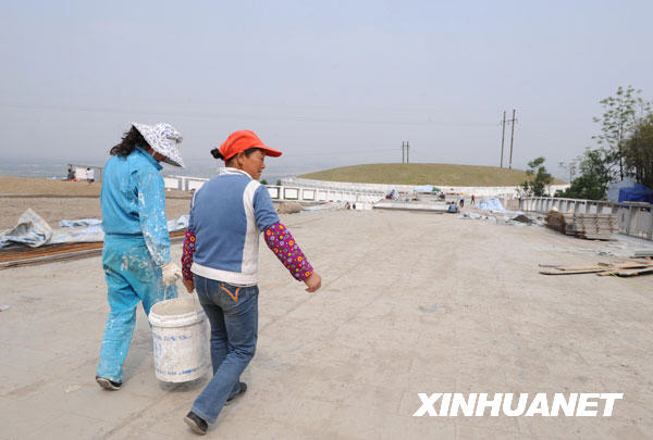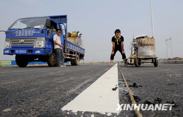 5月3日,工人在為綿竹市漢旺新鎮(zhèn)寬闊的馬路畫分道線。新華社記者陳燮攝