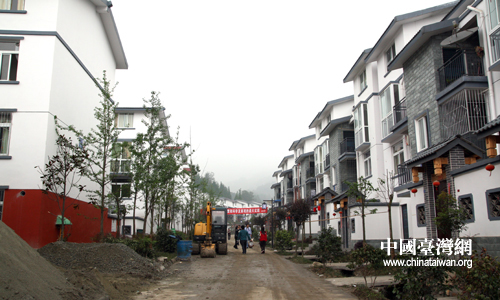 走進(jìn)都江堰市向峨鄉(xiāng)棋盤村董家新院子安置點(diǎn),寬闊的道路兩旁是聯(lián)排或獨(dú)棟的三層西式建筑,有些已經(jīng)竣工并有村民入住,有些則還在修建當(dāng)中。(中國臺灣網(wǎng) 田云鵬 攝)