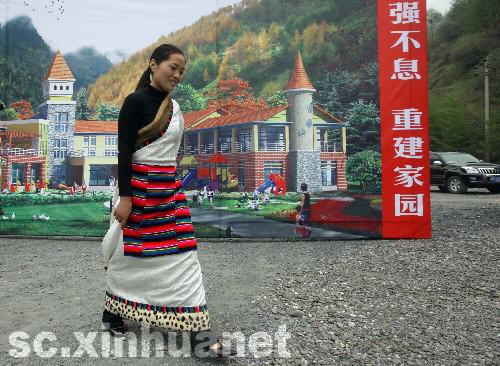 4月17日,在開工儀式現場,一名幼兒家長代表從臥龍鎮(zhèn)幼兒園效果圖前經過。新華社記者邢廣利攝