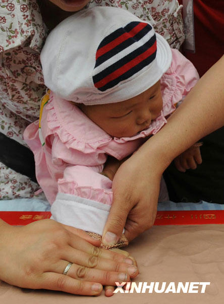 5月13日,地震“羅漢娃”在生日抓周會(huì)上按手模。新華社記者陳燮攝