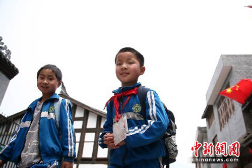 汶川八一小學(xué)學(xué)生放學(xué)后從紅旗招展的水磨鎮(zhèn)經(jīng)過。