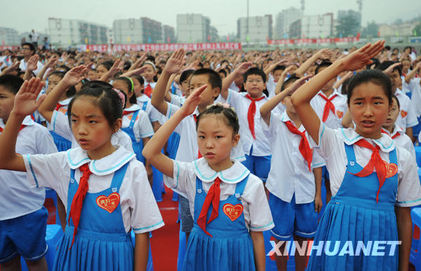 當(dāng)日,都江堰市災(zāi)后重建竣工投入使用的48所中小學(xué)校交接儀式暨2009年秋季開學(xué)典禮在都江堰市北街小學(xué)新校區(qū)舉行。全市7萬(wàn)余名中小學(xué)生全部告別了板房學(xué)校,搬進(jìn)了災(zāi)后重建的永久性校園學(xué)習(xí)。 新華社記者 江宏景 攝