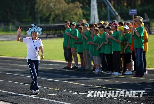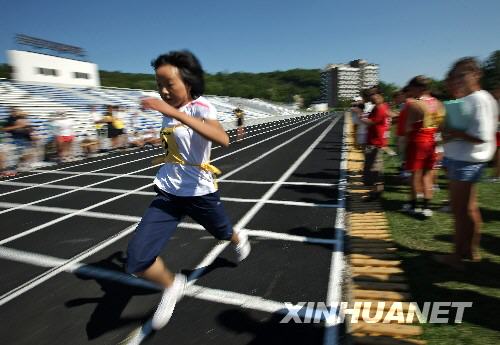 8月3日,在俄羅斯南部黑海之濱圖阿普謝的“小鷹”全俄兒童中心,正在這里療養(yǎng)的四川地震災(zāi)區(qū)學(xué)生(左二)與俄羅斯學(xué)生一起參加百米跑比賽。當(dāng)日,“小鷹”全俄兒童中心舉行運動會,中俄學(xué)生同場競技,一展風(fēng)采。新華社記者沈伯韓攝
