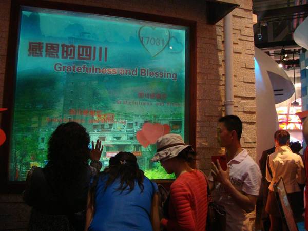 當(dāng)天,世博會四川館的愛心墻大屏幕上不斷播放著汶川地震的場景以及重建美好家園的影音畫面。從各地趕來的游客也紛紛到此參觀,并駐足按下自己的愛心手印。截至當(dāng)天下午15時許,愛心墻上共留下了17053個愛心手印。