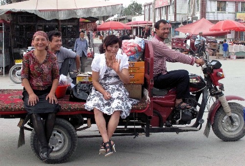 7月14日,庫車縣齊滿鎮(zhèn)農(nóng)民乘車趕巴扎。新華社記者 沈橋 攝