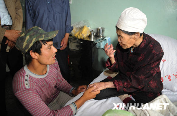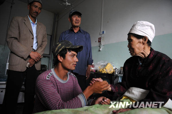 7月14日,吐拉甫江·夏木西。ㄗ笠唬┖桶⒉欢及帷に沟峡耍ㄗ蠖┰卺t(yī)院看望王玉蓮大媽。當(dāng)日,新疆阿克陶縣表彰兩位見義勇為的維吾爾族青年吐拉甫江·夏木西丁和阿不都艾尼·斯迪克,授予他們“民族團結(jié)見義勇為先進個人”榮譽稱號。7月12日,他們倆不顧個人安危,將失足掉入河水中的82歲漢族婦女王玉蓮救起,吐拉甫江還對周圍群眾說:“漢族媽媽也和我的媽媽一樣!”新華社記者周文杰攝