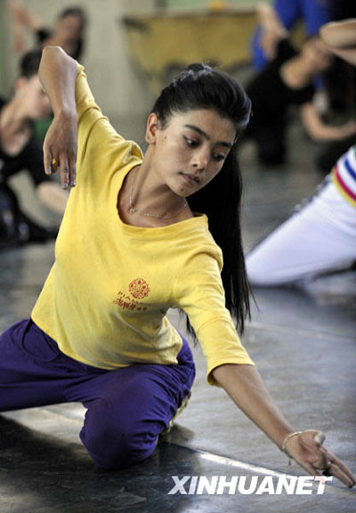 7月15日,新玉文工團(tuán)舞蹈演員在排練舞蹈。從2009年5月開始,新疆和田地區(qū)新玉文工團(tuán)集中各方面的專家制作了歌舞劇《和田,大有希望》。這部劇目采用歌舞、小品等形式集中反映了和田地區(qū)新中國成立60年來在各方面取得的巨大成就。預(yù)計(jì)該劇目將于9月中旬前往烏魯木齊進(jìn)行匯報(bào)演出,為新中國成立60年獻(xiàn)禮。新華社記者 趙戈 攝