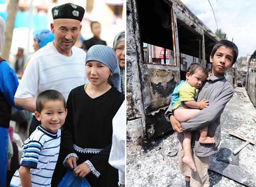 左圖:7月4日,一名男孩和家人在烏魯木齊二道橋逛街。新華社記者 魯煒攝 右圖:7月6日,在烏魯木齊市北灣街,被大火焚燒的汽車旁,一位少年緊緊抱著一名受到驚嚇的嬰兒。新華社記者 沙達提 攝