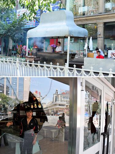 上圖:7月4日,烏魯木齊二道橋附近的羊肉串攤。 新華社記者 魯煒攝下圖:7月9日,在烏魯木齊二道橋的一家餐飲店,一位店員在值班看店。這家餐飲店在“7·5”事件中門面被砸。新華社記者侯俊攝