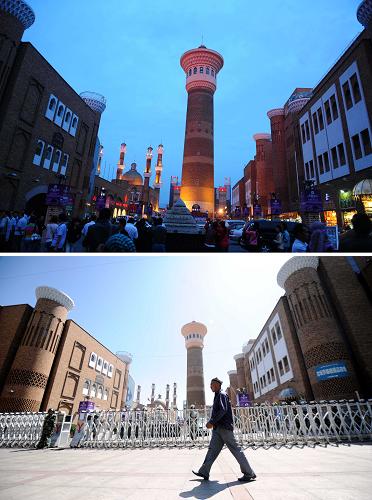 上圖:7月1日,烏魯木齊的新疆國際大巴扎游人如織。 新華社記者 魯煒攝下圖:7月9日,一名行人路過烏魯木齊的新疆國際大巴扎門前。新疆國際大巴扎在“7·5”事件后中止營業(yè)。 新華社記者沙達提攝