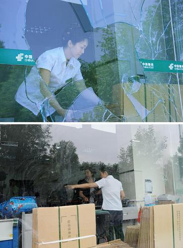 上圖:7月9日,在“7·5”事件中被砸壞外墻面玻璃的烏魯木齊三屯碑郵政支局開始恢復(fù)營業(yè),員工劉紅燕在被砸壞的玻璃后整理紙箱。新華社發(fā)(干樺攝)下圖:7月14日,烏魯木齊三屯碑郵政支局已經(jīng)將被砸壞的玻璃清理,員工在幫助顧客辦理包裹業(yè)務(wù)。新華社記者徐亮攝