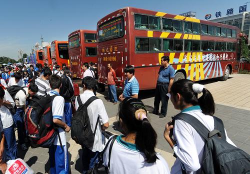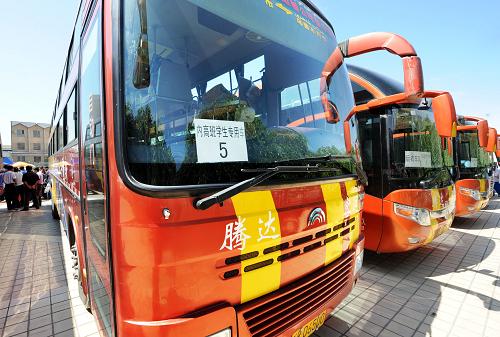 7月16日,學(xué)生專用車在烏魯木齊火車西站等候運(yùn)送學(xué)生。目前新疆內(nèi)地高中班學(xué)生放假返疆進(jìn)入高峰期,新疆交通部門為此開(kāi)通了內(nèi)高班學(xué)生運(yùn)輸“綠色通道”,專門抽調(diào)車況優(yōu)良的車輛,選擇有經(jīng)驗(yàn)的駕駛員,確保將學(xué)生安全、快捷地送回家鄉(xiāng)。新華社記者 李紫恒 攝