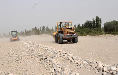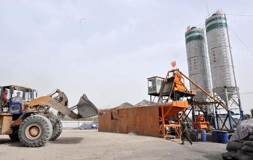 7月21日,在新疆和田火車站施工現(xiàn)場(chǎng),工人駕駛鏟車,將原料倒入混凝土攪拌機(jī)內(nèi)。在建設(shè)中的喀(什)和(田)鐵路正線全長(zhǎng)487公里,項(xiàng)目投資估算總額46.4億元,預(yù)計(jì)于2010年建成通車。屆時(shí),“和諧號(hào)”動(dòng)車組將運(yùn)行于塔克拉瑪干沙漠南緣,加速南疆三地州(喀什地區(qū)、和田地區(qū)、克孜勒蘇柯?tīng)柨俗巫灾沃荩┑慕?jīng)濟(jì)社會(huì)發(fā)展。新華社記者 金良快 攝