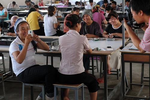7月22日,在韶關(guān)旭日玩具廠務(wù)工的一名新疆籍員工(前左)拿起手機(jī)與正在采訪的記者對(duì)拍起來。目前在韶關(guān)旭日玩具廠工作的新疆籍員工有755人,7月以來,員工總數(shù)一直保持穩(wěn)定。韶關(guān)市委副書記林耀明表示:“我們不會(huì)讓一次偶然發(fā)生的治安事件影響到韶關(guān)和新疆的經(jīng)貿(mào)合作和務(wù)工交流。未來我們將進(jìn)一步采取措施,妥善安置新疆籍員工在韶關(guān)的務(wù)工、生活,讓他們?cè)谏仃P(guān)長(zhǎng)期安心就業(yè)。”新疆勞務(wù)輸出先進(jìn)縣——喀什地區(qū)疏附縣負(fù)責(zé)人也表示:“經(jīng)過廣東和新疆兩方面的共同努力,在韶關(guān)安心地長(zhǎng)期就業(yè),已是這里700多名新疆少數(shù)民族外出務(wù)工人員的共同心聲”。由于近日廣東天氣炎熱、氣候潮濕,有個(gè)別新疆籍員工感到不適應(yīng)而離開韶關(guān)返回家鄉(xiāng)。旭日玩具廠負(fù)責(zé)人說,盡管采取了一系列防暑降溫措施,但由于兩地氣候環(huán)境差異大,還是有一些新疆籍員工感冒、中暑!八麄兓匦陆苁,我們是理解的。歡迎他們?cè)谑钇谶^后繼續(xù)回來工作!边@位負(fù)責(zé)人說。 新華社記者 劉大偉 攝