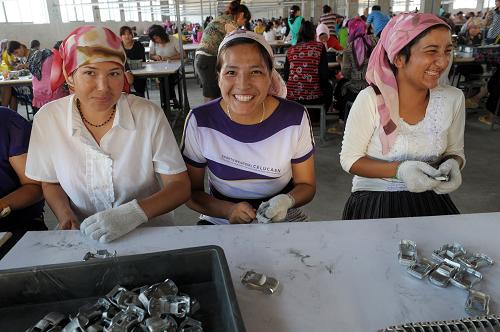 7月22日,在韶關(guān)旭日玩具廠務(wù)工的新疆籍員工努爾古麗·麥麥提玉蘇甫(左)和熱孜凡尼古麗·麥麥提玉蘇甫(中)姐妹倆在生產(chǎn)線上工作。新華社記者 劉大偉 攝