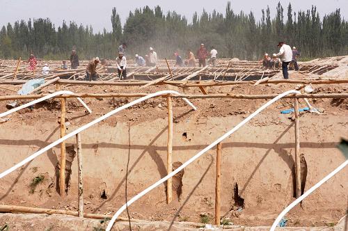7月23日,由各村組抽調(diào)的義務(wù)工在恰熱克鄉(xiāng)450畝大棚示范區(qū)維修棚架。新疆喀什地區(qū)莎車縣現(xiàn)有2.78萬畝蔬菜大棚,今年小麥豐收后,鄉(xiāng)政府在農(nóng)閑時(shí)間組織農(nóng)民投入到蔬菜大棚的維修和建設(shè)工作中,為冬季反季節(jié)蔬菜的種植增收打好基礎(chǔ)。新華社記者 周文杰 攝