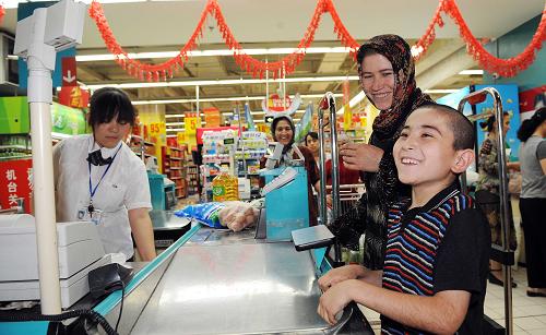 7月23日,市民在家樂福烏魯木齊大巴扎店購物。當(dāng)日,自烏魯木齊“7·5”事件后閉店17天的家樂福烏魯木齊大巴扎店重新開門營業(yè)。新華社記者 沙達(dá)提 攝