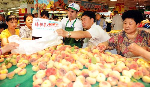 7月23日,顧客在家樂福烏魯木齊大巴扎店挑選蟠桃。新華社記者 沙達(dá)提 攝