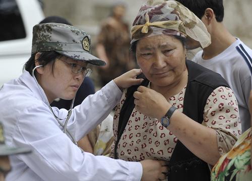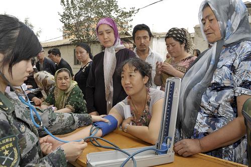 7月23日,解放軍第二十三醫(yī)院醫(yī)務(wù)人員為烏魯木齊八戶梁社區(qū)一位居民量血壓。當(dāng)日,解放軍第二十三醫(yī)院醫(yī)務(wù)人員來到烏魯木齊八戶梁社區(qū)開展義診活動(dòng),社區(qū)內(nèi)上百位各族居民前來問診,軍醫(yī)們還為當(dāng)?shù)刭?zèng)送了一些常用藥品。新華社記者 趙戈 攝