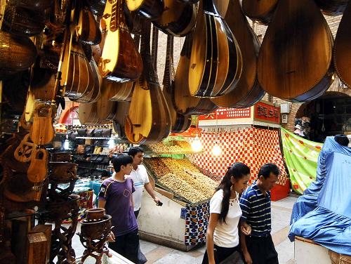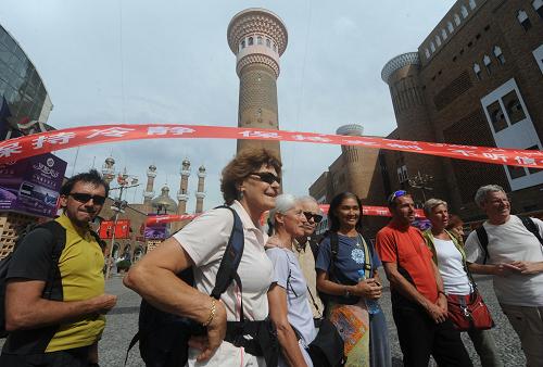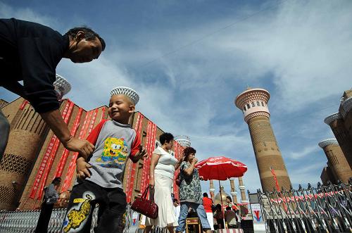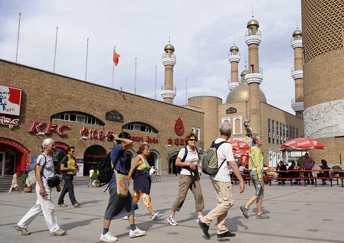 來(lái)自法國(guó)的游客在逛烏魯木齊國(guó)際大巴扎(7月23日攝)。 新華社記者 戴旭明 攝
