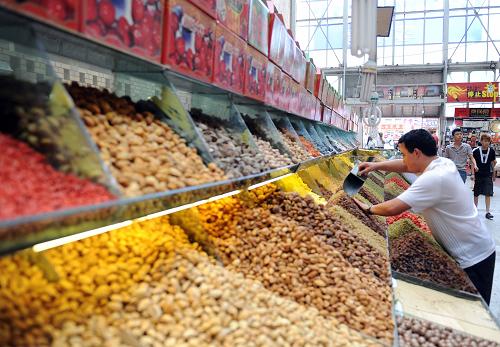 7月26日,一名商販在烏魯木齊國(guó)際大巴扎整理干果。新華社記者 沙達(dá)提 攝