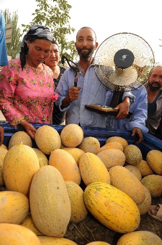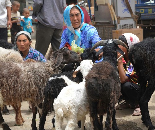 7月25日,幾名農(nóng)村婦女在喀什國際大巴扎上銷售自家喂養(yǎng)的羊。在南疆的喀什、阿克陶、莎車和葉城等地,一到維吾爾族群眾的巴扎(趕集)日,人們紛紛來到設(shè)在城市周邊的巴扎上交易,形成了喀什國際大巴扎、葉城新世紀農(nóng)貿(mào)市場、阿克陶縣中心農(nóng)貿(mào)市場等一批每天人流量達5萬以上的超級大巴扎。新華社記者 周文杰 攝