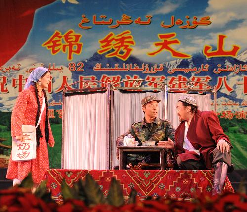 7月29日,新疆藝術(shù)劇院話劇團(tuán)演員在表演小品《保險(xiǎn)》。當(dāng)晚,由新疆維吾爾自治區(qū)文化廳主辦的《錦繡天山》慶祝八一建軍節(jié),慰問武警、公安干警文藝晚會(huì)在新疆藝術(shù)劇院上演,精彩的文藝表演贏得在場(chǎng)官兵的熱烈掌聲。 新華社記者 沙達(dá)提 攝