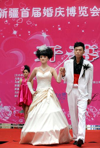 8月6日,模特在婚慶博覽會(huì)上展示婚禮服裝。當(dāng)日,新疆首屆婚慶博覽會(huì)在烏魯木齊市新疆國(guó)際博覽中心開(kāi)幕。婚慶博覽會(huì)分為婚紗、攝影精品、結(jié)婚首飾精品、婚慶服務(wù)、喜宴用品、新婚家居精品、家用汽車(chē)等8個(gè)展區(qū)。 新華社發(fā)(江文耀 攝)