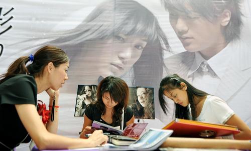 8月6日,一名參展人員(左)在婚慶博覽會(huì)上向顧客介紹婚紗攝影。 新華社發(fā)(江文耀 攝)
