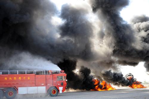 8月6日,一輛消防車在演習現(xiàn)場滅火。當日,新疆喀什地區(qū)應(yīng)急辦和喀什機場等單位聯(lián)合舉辦機場處突應(yīng)急救援綜合演習。演習旨在檢驗公安、武警和衛(wèi)生等部門在突發(fā)狀況下的協(xié)同配合能力。 新華社記者 周文杰 攝