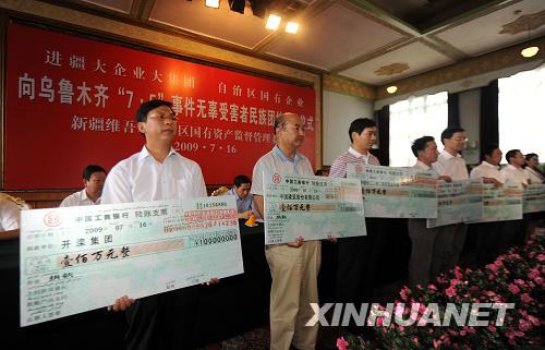 16日,神華集團(tuán)、中糧集團(tuán)、寶鋼集團(tuán)等33家中央及外。▍^(qū)、市)駐疆國(guó)有企業(yè)和中泰化學(xué)、中國(guó)移動(dòng)新疆公司、新疆有色集團(tuán)等33家自治區(qū)國(guó)有企業(yè)的代表齊聚烏魯木齊昆侖賓館,向“7·5”事件受害者和財(cái)產(chǎn)受損失的群眾捐款。其中,神華集團(tuán)捐款5050萬(wàn)元,中糧集團(tuán)捐款2000萬(wàn)元,寶鋼集團(tuán)、中國(guó)保利集團(tuán)、國(guó)家電網(wǎng)公司和國(guó)家開(kāi)發(fā)投資公司等6家中央駐疆國(guó)有企業(yè)捐款在1000萬(wàn)元以上。