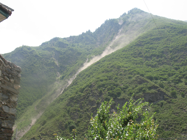 2008年7月10日,四川青年志愿者戴濤在汶川地震中心附近的甘堡藏寨拍攝的正在發(fā)生余震時的山坡泥石流。