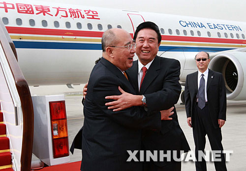 5月27日下午,中國國民黨主席吳伯雄率領(lǐng)中國國民黨大陸訪問團(tuán)抵達(dá)北京首都國際機(jī)場。中共中央臺辦主任陳云林到機(jī)場迎接。 新華社記者 龐興雷 攝